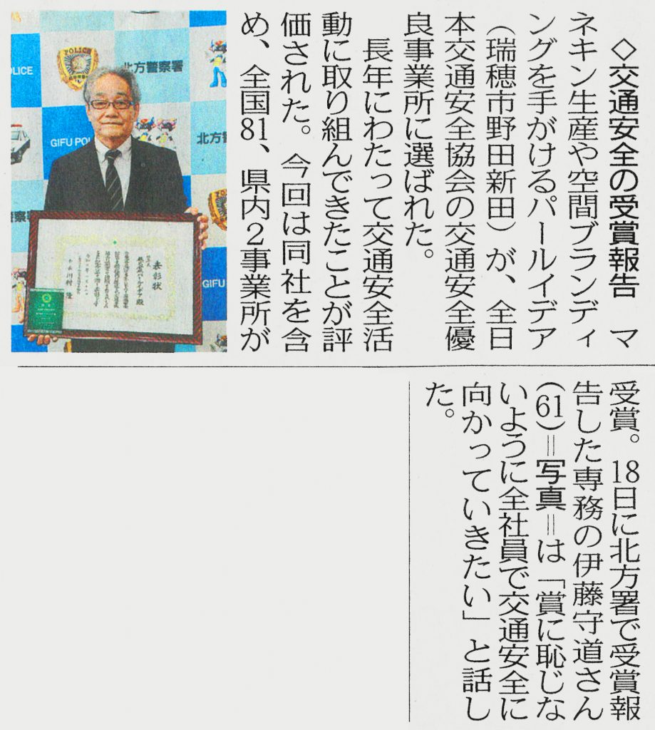 この度パールイデア(本社 岐阜県)は、全日本交通安全協会より、1984年に安全運転管理者等選任事業所として岐阜県公安委員会に登録して以降、今日に至るまでの地域の安全向上活動を評価され、交通安全優良事業所に選ばれました。(本件は、2024年1月19日発行の中日新聞に記事として掲載されました)これからも、お客様・協力先様はじめご関係の皆様への感謝の気持ち忘れずに、全社員で交通安全を続けてまいります。