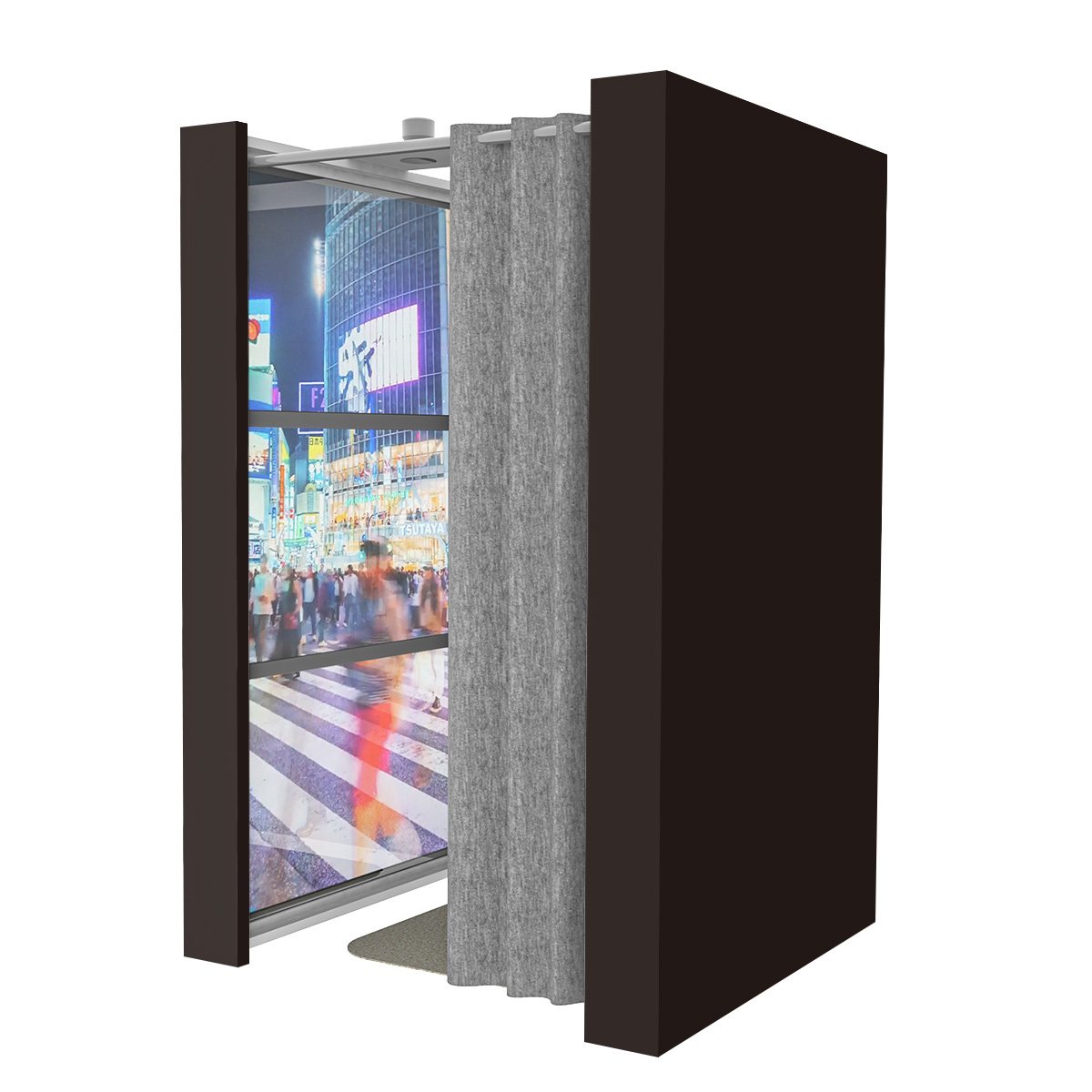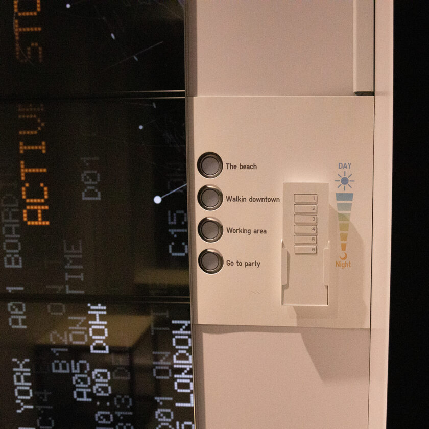 スイッチ操作で、BeachシーンやNightシーンなど、簡単にバックスクリーン映像の切り替えが可能です。また、映像と連動した調光スポットライトと超指向性スピーカー(特定域のみ音が聞こえる)でのミュージックで、コーディネイトにあったシーンでのフィッティングが可能です。