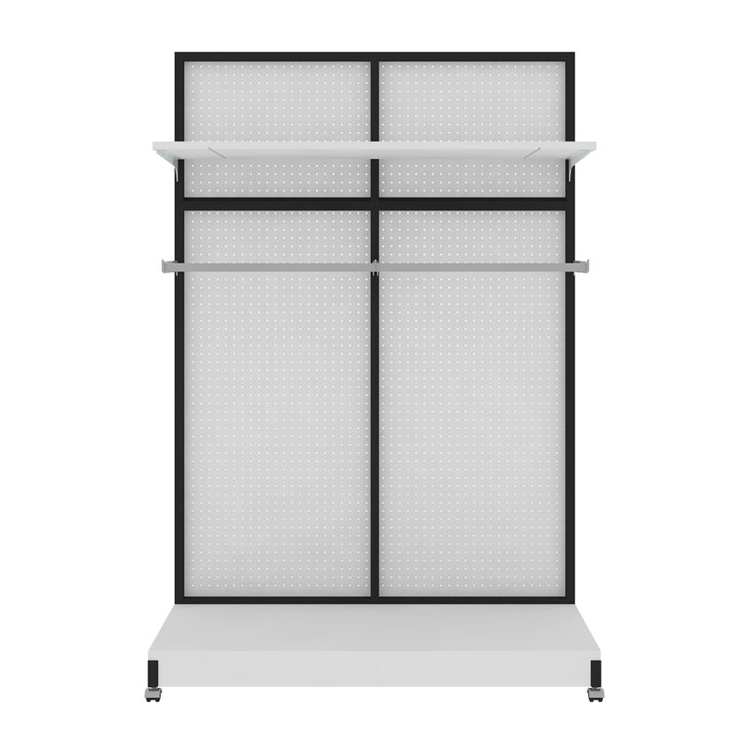 組み合わせを変えることで、使用スペースやMD構成にフレキシブルに対応できます。パネルは有孔ボードを標準として、ビジュアルやサインの打ち出しも可能です。