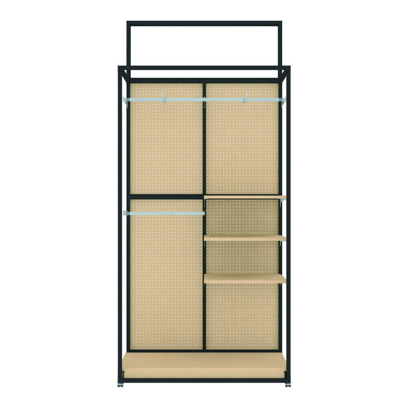 組み合わせを変えることで、使用スペースやMD構成にフレキシブルに対応できます。パネルは有孔ボードを標準として、ビジュアルやサインの打ち出しも可能です。