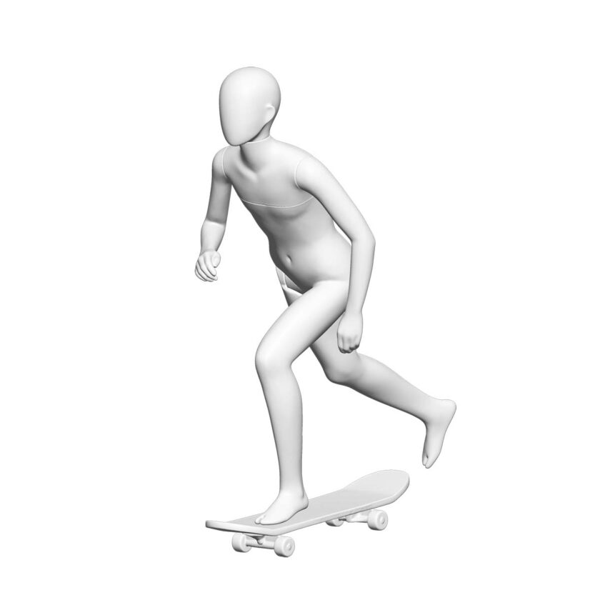 「公園で遊ぶ子どもたち」の楽しげな瞬間を、そのままディスプレイに映し出したキッズマネキンです。犬やスケートボードなどのプロップスを組み合わせれば、自然で楽しい風景がすぐに完成します。100〜150cmの6サイズ展開、ボーイズ・ガールズ共通デザインなので、服のスタイリングでさまざまな表情を演出できます。脚は可動式で、ポーズが大きくても着せ替えの負担を軽減。温かみと親しみを感じさせるディスプレイに最適なシリーズです。