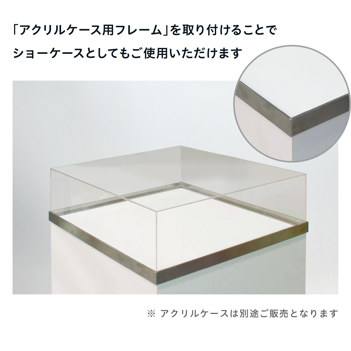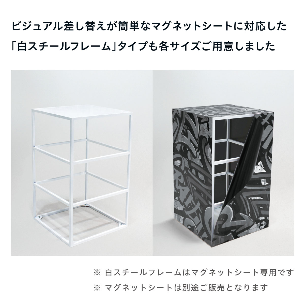 サイズはw350×d350×高さ4種、w450×d450×高さ5種に加え、白(化粧板)とスチールフレームの2タイプ。スチールフレームは全面をマグネットシートで囲うことで、ビジュアルやサイン等の訴求が可能。別途アクリルケースを上部に乗せることで、ショーケース的なアレンジも可能。