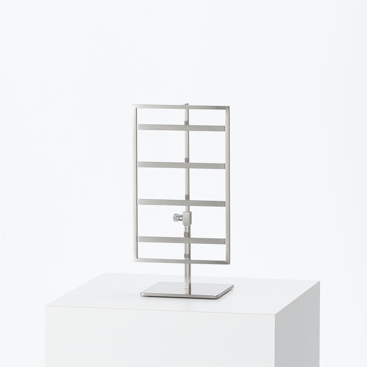 “強度”と“機能性”を両立させた、あらゆるシーンに対応できるツールシリーズ「SIMPLE LINE 02 TOOLS」。 9×9mmの細いスチール素材を使用し、いかに “商品を美しく魅力的に見せるか”を追求し、デザインされたピアススタンド(卓上アクセサリー台)。シンプルな形状で、商品を引き立てます。