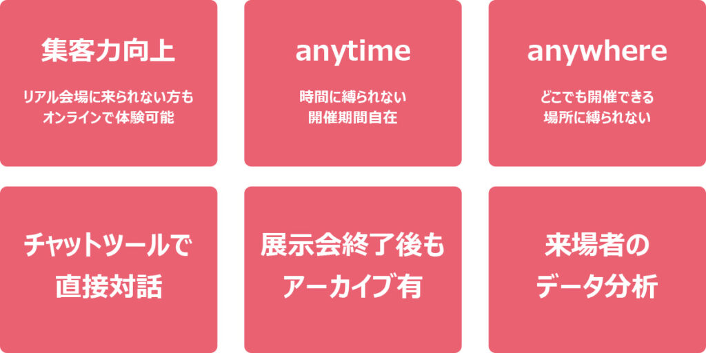 デジタルのみの展示会は営業効果が見えずらいというお声をよく聞きます。また展示会に限らず、ECショップのみの展開、ビデオ通話のみの社内教育コミュニケーションなど、デジタルツールのみの活用だけでは発揮できない効果を、リアルな場とあわせて提供していくことが今後必要です。
