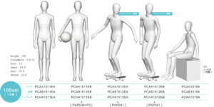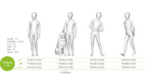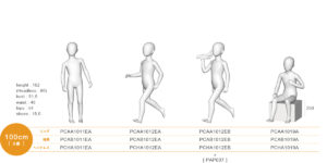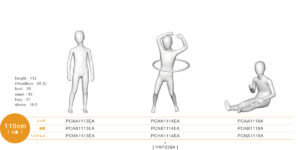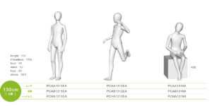 サイズ展開は100cm、110cm、120cm、130cm、140cm、150cm。各サイズにつき3ポーズずつ計18型をベースに、腕バリエーションもある豊富なラインナップからお選びいただけます。活気あるアクションポーズを中心に、使いやすい基本ポーズも各サイズごとにご用意しております。