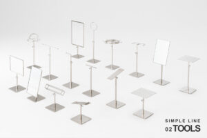 “強度”と“機能性”を両立させた、あらゆるシーンに対応できるツールシリーズが「SIMPLE LINE 02 TOOLS」。 9×9mmの細いステンレス素材を使用し、いかに “商品を美しく魅力的に見せるか”を追求し、デザインしました。