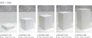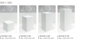 サイズは350×350×高さ4種 , 450×450×高さ5種。 アパレルから靴やアクセサリー・雑貨まで、幅広く対応できる計9サイズをラインナップ。