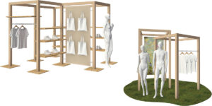 さらに、梁をつなげることでゾーニングや空間演出に応用でき、環境構築什器としてのアレンジ性も高いのが特長。 限られたスペースでもブランドの世界観をしっかりと伝えられる、頼もしいシリーズです。