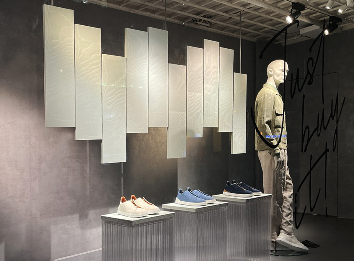 1年越しにこの素材の採用が実現し、持続可能な未来に貢献しています。 また、マネキンには当社が取り扱うフランスのWINDOW社「PURE(ピュア)」シリーズを採用し、高品質なディスプレイを提供できました。