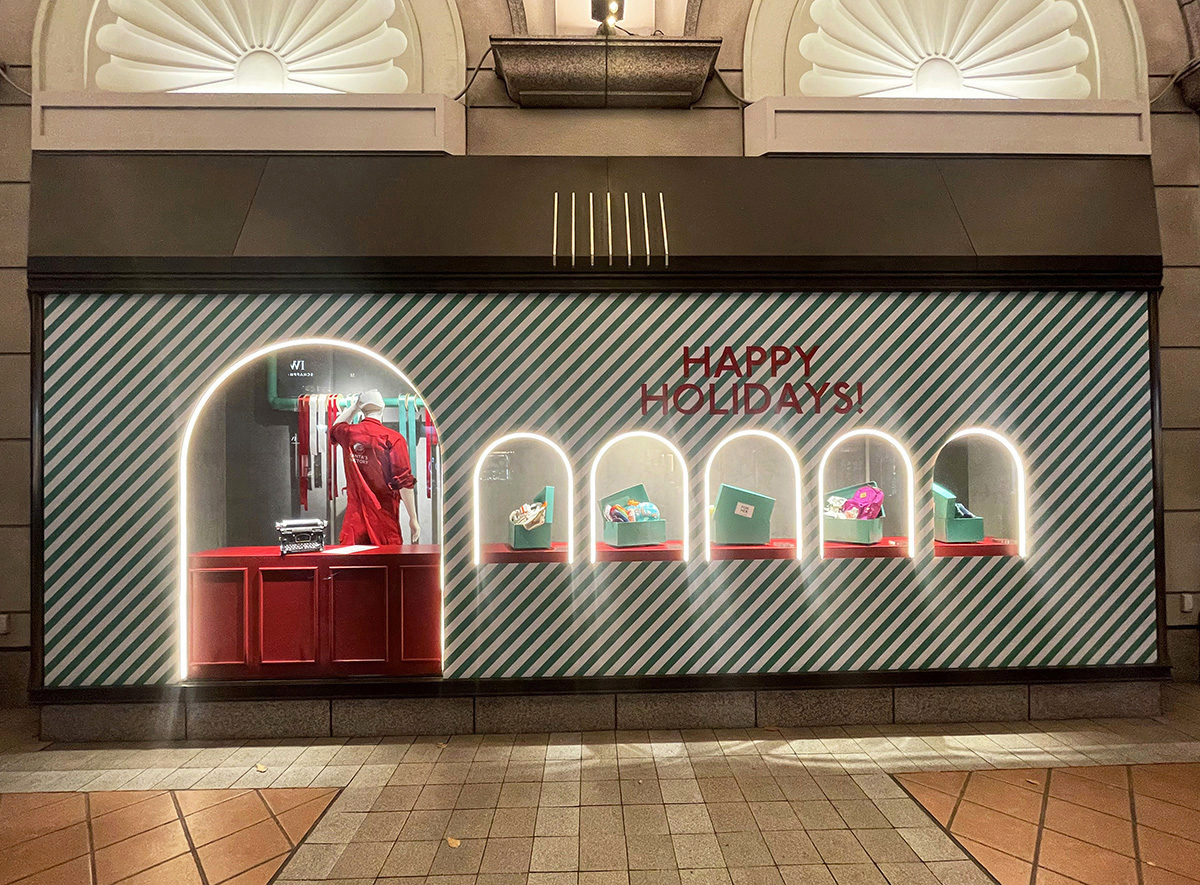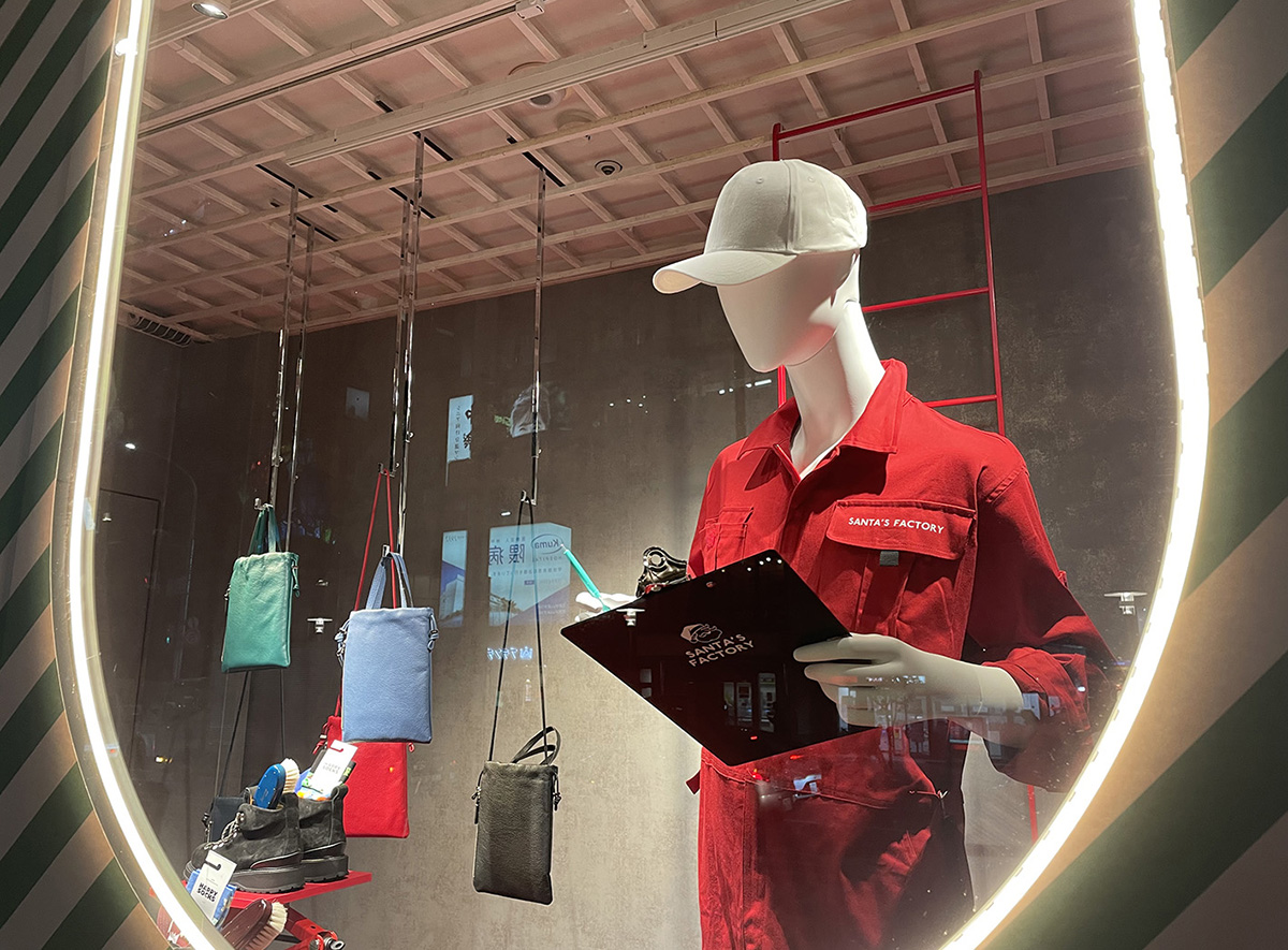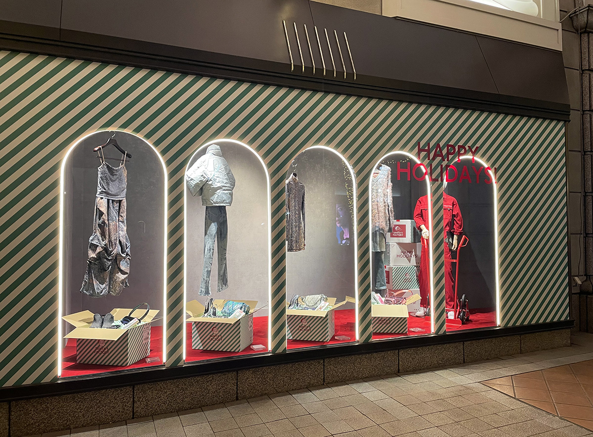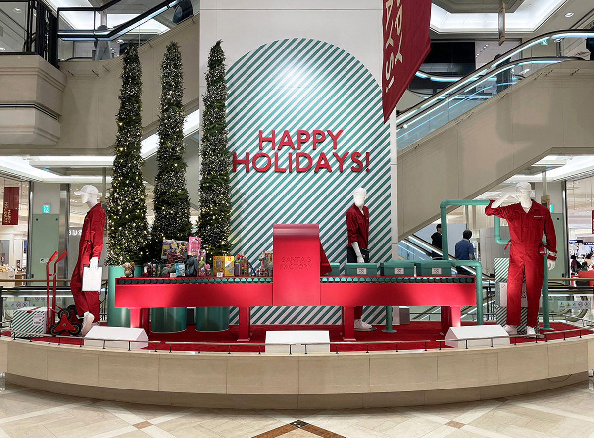 テーマは「SANTA'S FACTORY」。働くフィールドワーカーたちがプレゼントを準備する姿をディスプレイで表現しました。 クライアントのカラーである緑のストライプ柄をメイングラフィックに、赤い造作をアクセントにしたクリスマス配色が目を引きます。 さらに、アーチ型LEDライトが温かみを演出し、冬の街並みに特別な輝きをプラス。ターンテーブルやフックモーターを駆使した仕掛けが、FACTORYのダイナミックな雰囲気を盛り上げます。