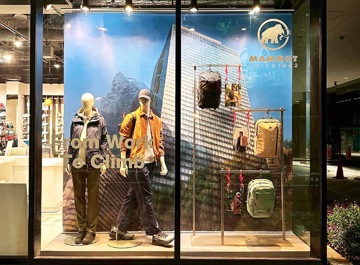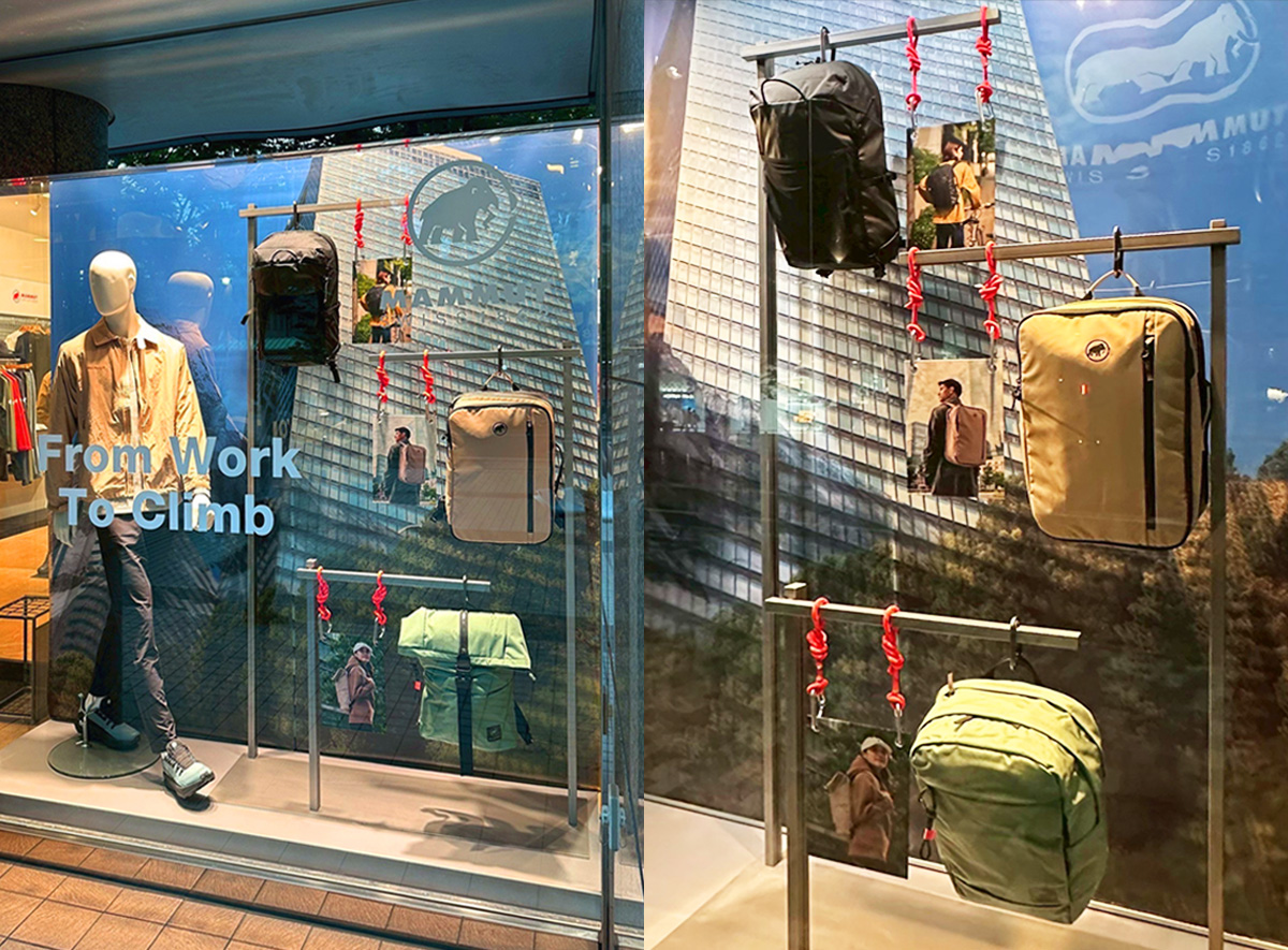 1862年、ロープメーカーとして誕生して以来、職人技と革新性を融合させた高品質なアウトドアギアを世界に発信し続けています。 今回のディスプレイテーマは 「From Work To Climb」。 街(WORK)と山(OUTDOOR)を重ね合わせたバックパックの世界観を、背面にはシティを、半透明のレイヤー越しに山のシルエットを浮かび上がらせる構成で表現しました。 ブランドの象徴であるロープを吊元にアレンジし、マムートの原点を象徴的に演出。 ウインドウだけでなく、メインテーブル上でも同コンセプトを反映したインストアツールを展開し、“From Work To Climb”を立体的に伝える空間デザインを実現しました。