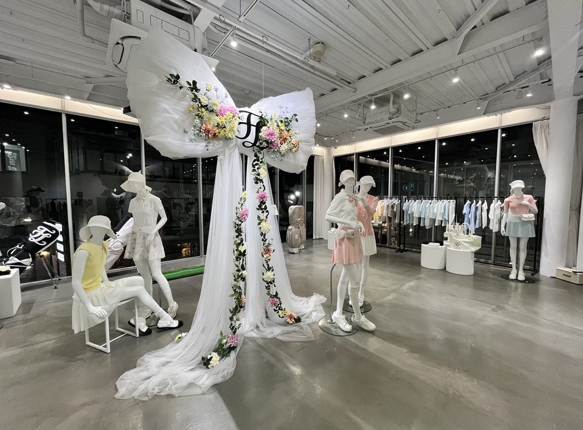 本案件は、企画会社 TRACKS LLC と MAHHAUS からの依頼を受け、バイヤーやインフルエンサー向け展示会の空間づくりを担当し、ブランドの物語性を来場者が体感できる演出が求められるプロジェクトでした。 空間は、Fair Liar の柔らかな世界観を象徴する「リボン」をモチーフに構成。白を基調に、曲線を活かしたデザインで軽やかさと女性らしさを演出し、ブランドの魅力を引き立てました。 マネキンには、ガーリーなフォルムが特徴の「emma(エマ)」を採用。可憐で柔らかな佇まいがコレクションの若々しいムードと調和し、商品展示にとどまらない印象的な空間を創出しています。